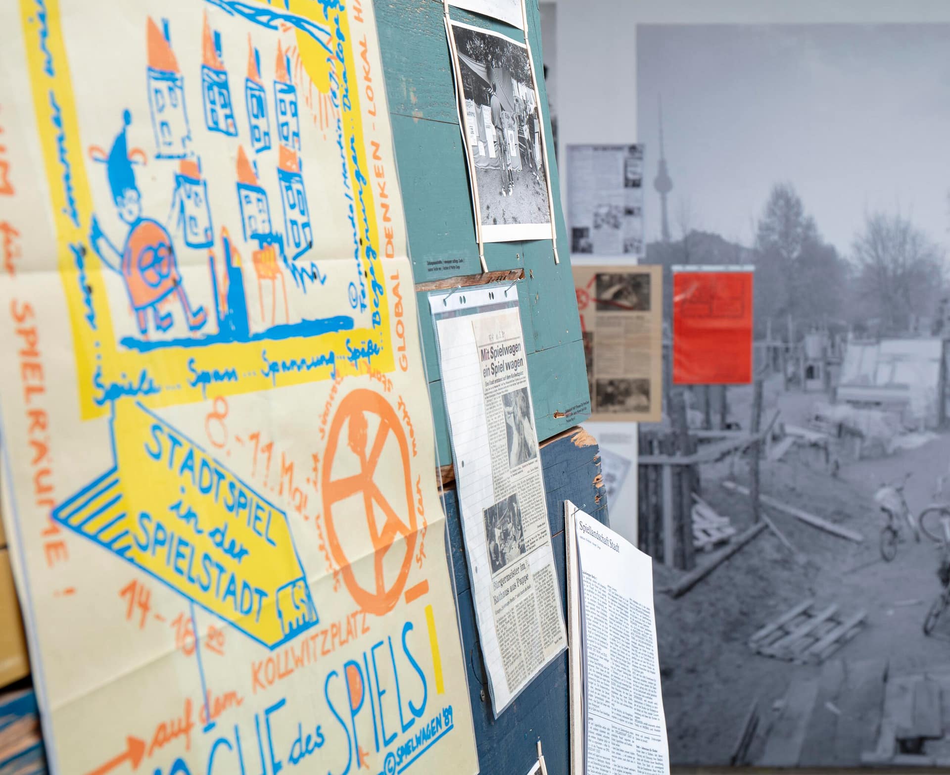 ‘Spielwagen Berlin 1’, the focus of this exhibition, continued its activities primarily in Prenzlauer Berg, developing construction-based formats such as the Stadtspiel, in which children collectively built small towns from cardboard and planks and enacted democratic processes in public space. These experimental practices of utopia making took place in the final years of the SED regime, within a still tightly controlled political context. During the period of upheaval and German Reunification, opportunities for institutional reinvention opened up for the group. In early 1990, some members of ‘Spielwagen Berlin 1’ founded ‘Netzwerk Spiel/Kultur Prenzlauer Berg e.V.’ – a still existing embodiment of their political ideals grounded in care, local action, and participatory democracy.